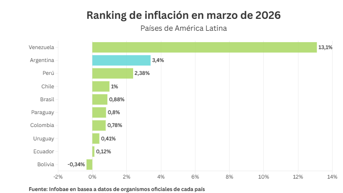 En el primer puesto del ranking regional de inflación se encuentra Venezuela. Según las mediciones del Banco Central de Venezuela, el país caribeño registró un 13,10% de inflación mensual en marzo. Esta cifra lo consolida como el caso más crítico de la región, acumulando en el primer trimestre de 2026 un alza de precios del 71,80%. La dinámica venezolana sigue operando en una escala completamente diferente a la de sus vecinos, manteniendo niveles de dos dígitos mensuales de manera persistente.