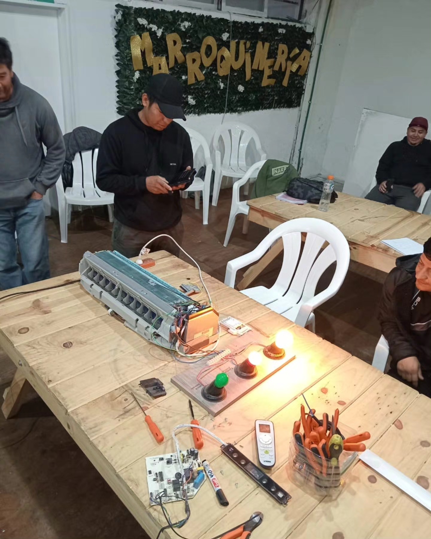 En la EMAOP (Escuela Municipal de Artes y Oficios de Plottier), los estudiantes de refrigeración están adquiriendo habilidades prácticas en el mantenimiento preventivo de unidades de aire acondicionado tipo split. Durante las clases, los alumnos realizan inspecciones detalladas para determinar el funcionamiento correcto de las unidades.