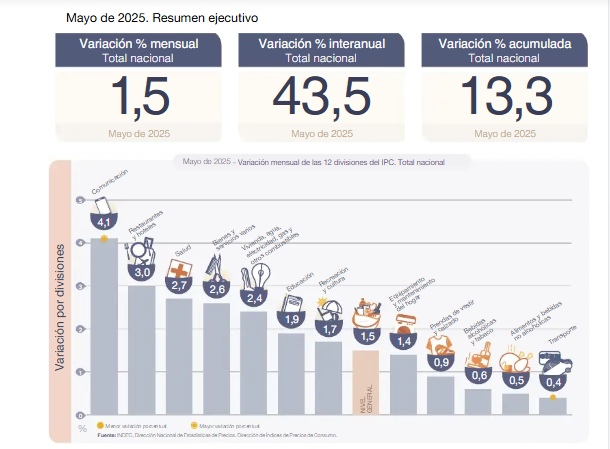 Por otro lado, la inflación en el acumulado de los primeros cinco meses de 2025 tuvo una variación de 13,3%.