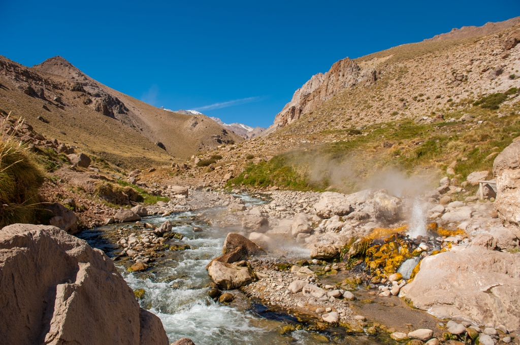 La siguiente parada obligatoria es Aguas Calientes. Distante poco más de 30 kilómetros de Varvarco, combina naturaleza agreste y propiedades termales únicas. Este recurso fue objeto de estudio por parte del Dr. Gregorio Álvarez, quien investigó las propiedades terapéuticas de las algas y llevó adelante tratamientos clínicos para afecciones dermatológicas.