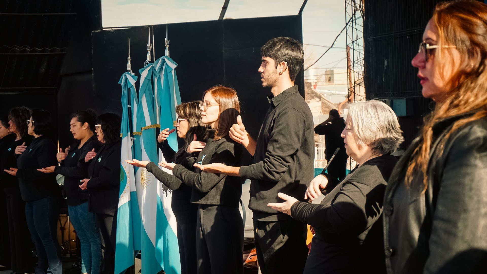 En primer lugar, en presencia de las banderas de las escuelas de la Localidad, se canto los Himnos Nacional, Provincial y la Marcha de las Malvinas, interpretado también en “Lengua de Señas”, por los alumnos del Nivel 2 y 3 de la EMIP, posteriormente se leyeron los comunicados de adhesiones protocolares por parte de las autoridades provinciales y concejales.