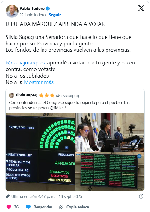 Los habituales cruces que se viven en el Congreso Nacional tuvieron un capitulo virtual hoy, cuando el diputado nacional Pablo Todero de justicialismo neuquino publicó en la red social X una reivindicación del voto de la senadora Silvia Sapag contra un veto del gobierno y etiquetó a la libertaria Nadia Márquez, pidiéndole que «aprenda».