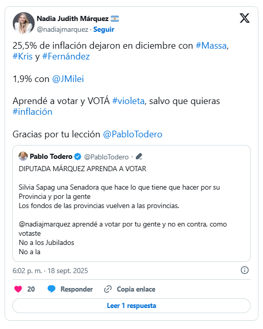Rápida de reflejos, Márquez utilizó la misma red social para contestarle a Todero, a quien relacionó con los malos resultados económicos del Gobierno pasado, comparados con los datos actuales que, a su juicio, muestran una clara mejoría, al tiempo que llamó a votar a La Libertad Avanza en las próximas elecciones, donde busca un escaño en la cámara alta.