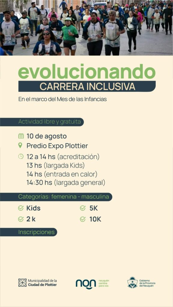 Este martes 29 de julio se llevó a cabo la conferencia de prensa de “Evolucionando”, la carrera inclusiva que se realizará el próximo 10 de agosto en el Predio Expo Plottier., con la presencia del Intendente Luis Bertolini, la Secretaria de Deportes, Cultura y Gestión Ciudadana, María Fernanda Villone, Juan Manuel Flores Secretario de Cultura y Ciudadanía, demás autoridades provinciales municipales, asociaciones intermedias , publico en general y representantes de la Prensa . Se estaco que la competencia se enmarca dentro de las actividades del Mes de las Infancias, con el objetivo de celebrar y promover el bienestar de niñas, niños y adolescentes, organizada por la secretaría de Deportes, Cultura y Gestión Ciudadana, dependiente del ministerio de Desarrollo Humano, Gobiernos Locales y Mujeres a cargo de Julieta Corroza.