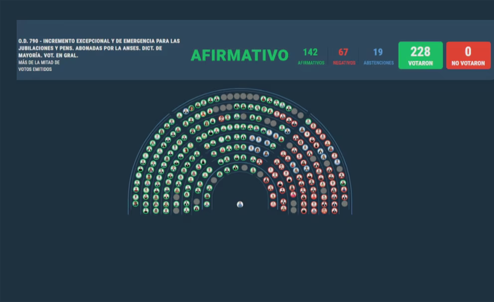 Con 142 votos positivos, 67 negativos y 19 abstenciones, la Cámara de Diputados aprobó en general el 7,2% de aumento para los jubilados. En una sesión maratónica, que fue seguida desde las inmediaciones del Congreso por una masiva movilización que incluyó reclamos por el Hospital Garrahan y una histórica convocatoria a 10 años del Ni Una Menos.