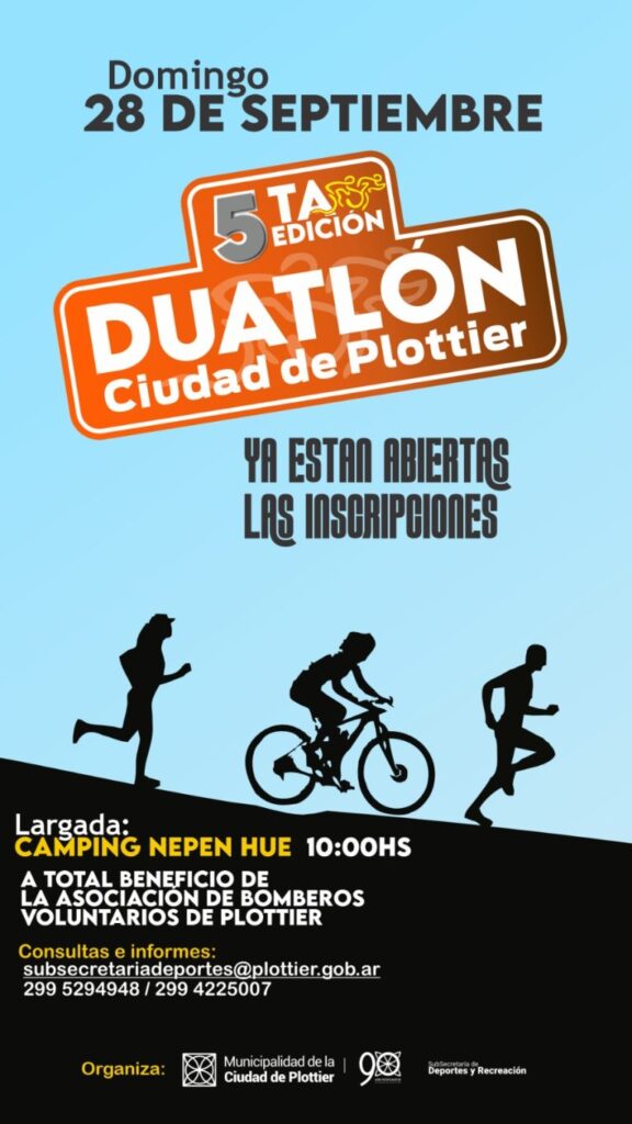 La Subsecretaria de Deporte y Recreación de Municipalidad de Plottier organiza por 5° año consecutivo el duatlón, una prueba combinada deportiva, única en la localidad de Plottier. Esta edición se llevará adelante el domingo 28 de septiembre, con largada en el Camping Nepen Hue a las 10 hs. y el total de lo recaudado por las inscripciones será destinado al cuerpo de Bomberos de la ciudad.
