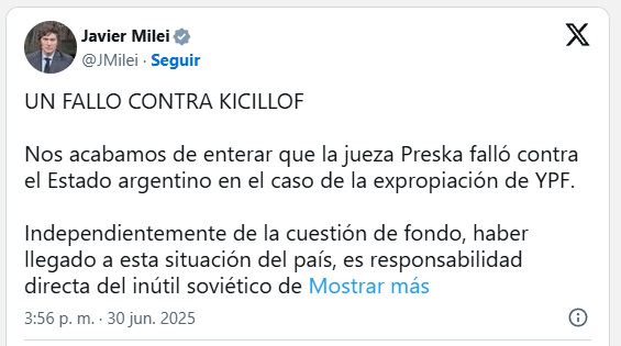 La información fue publicada por el presidente Javier Milei en su cuenta de X y expresó su postura señalando que el país “acaba de enterarse” del fallo de la jueza Preska en el caso de la expropiación de YPF. La situación judicial que llevó a esta condena millonaria, que ya ascendía a más de 16.000 millones de dólares, es atribuida de forma “directa” y sin matices al actual gobernador bonaerense, Axel Kicillof.MundoFallo. Loretta Preska: quién es la jueza neoyorquina que definirá el destino financiero de ArgentinaPorRedacción La Voz