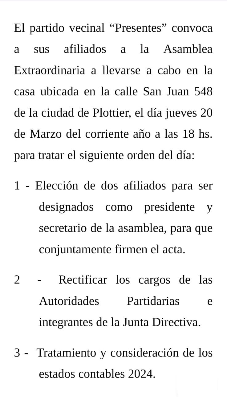 Plottier El Partido Vecinal “PRESENTES” de Plottier convoca a la Asamblea Extraordinaria Redacción SDN 17 marzo, 2025 1 min de lectura About the Author Redacción SDN Administrator Visit Website View All Posts What do you feel about this? 0% Love 0% Funny 0% Wow 0% Sad 0% Angry Plottier Post navigation Previous: Jubilados: desde marzo deberán hacer un trámite obligatorio para tener medicamentos gratuitosNext: Histórico: la Tigresa Acuña se retiró del boxeo en Plottier Deja una respuesta Cancelar la respuestaTu dirección de correo electrónico no será publicada. Los campos obligatorios están marcados con *Comentario * Nombre * Correo electrónico * Web Author's Other Posts Argentina volvió a hacer historia en el Mundial de la Pizza: tercer año seguido en el podio Argentina volvió a hacer historia en el Mundial de la Pizza: tercer año seguido en el podio El Hospital Plottier abre un espacio de acompañamiento para personas con diabetes El Hospital Plottier abre un espacio de acompañamiento para personas con diabetes Operativo de Garrafas Sociales recorrerá distintos barrios de Plottier Operativo de Garrafas Sociales recorrerá distintos barrios de Plottier Bertolini negó irregularidades y calificó de “persecución política” el pedido de prisión domiciliaria Bertolini negó irregularidades y calificó de “persecución política” el pedido de prisión domiciliaria Historias relacionadas Plottier El Hospital Plottier abre un espacio de acompañamiento para personas con diabetes Redacción SDN 21 abril, 2026 Plottier Operativo de Garrafas Sociales recorrerá distintos barrios de Plottier Redacción SDN 21 abril, 2026 Plottier Bertolini negó irregularidades y calificó de “persecución política” el pedido de prisión domiciliaria Redacción SDN 21 abril, 2026 Plottier Actualizan el horario de la feria de productores y artesanos Redacción SDN 21 abril, 2026 Plottier Detención en Plottier: un hombre con dos pedidos de captura Redacción SDN 19 abril, 2026 Plottier Plottier: el municipio trabaja en un nuevo puente para mejorar el acceso al EPET N.º 25 Redacción SDN 19 abril, 2026