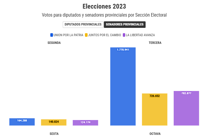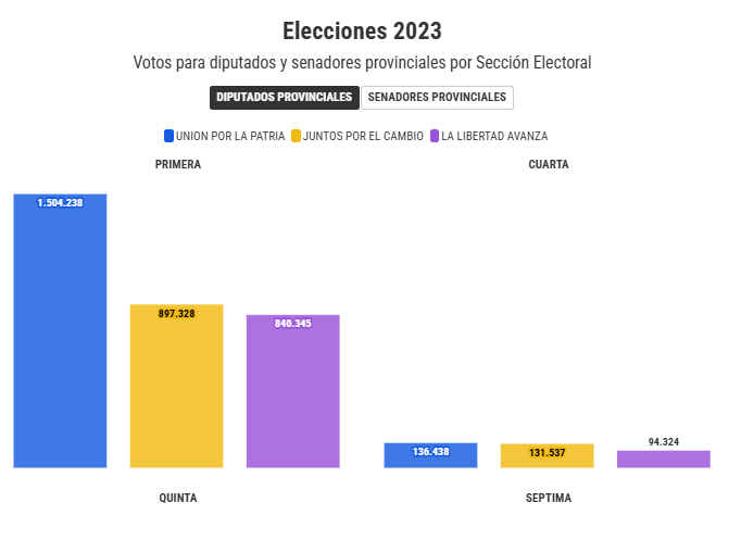 En las restantes Secciones Electorales, el peronismo también quedó primero en 2023 para el tramo de legisladores provinciales, con excepción de la Sexta, donde se impuso Juntos por el Cambio con el 33,14% (142.538 votos), seguido de UxP con el 32,71% (140.692 votos), y La Libertad Avanza 31,24% (134.384 votos).