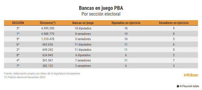 En los comicios del 7 de septiembre, en la Tercera Sección Electoral hay en juego 18 bancas de diputados provinciales; en la Segunda Sección Electoral, 11 diputados; en la Sexta, 11; y en la Octava, 6 diputados provinciales. En tanto en la Primera Sección, se eligen 8 senadores; en la Cuarta, 7; en la Quinta, 5; y en la Séptima, se renuevan tres senadores.