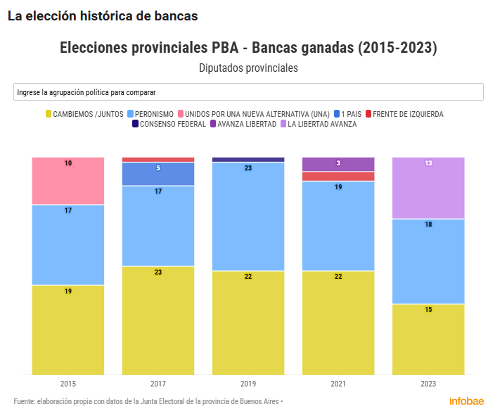 El peronismo, en tanto, se impuso en cantidad de bancas de diputados provinciales en 2019 (obtuvo 22 escaños), cuando el Frente de Todos ganó la elección nacional, y en 2023 (consiguió 15 bancas), cuando Milei le ganó a Sergio Massa en la presidencial.
