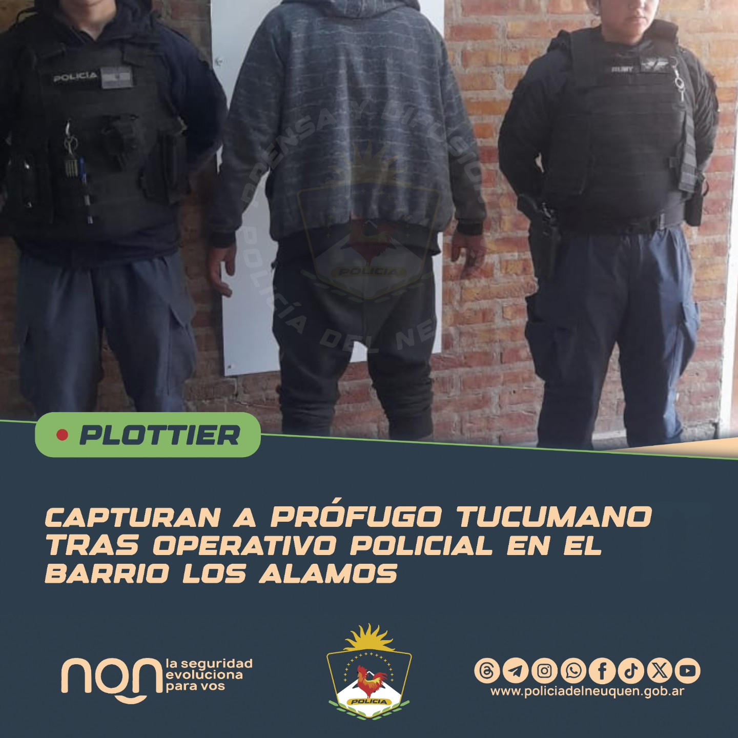 En un operativo que sorprendió a los vecinos del barrio Los Álamos de la ciudad de Plottier, la Policía de Neuquén demoró a un hombre de 28 años que tenía una orden de captura vigente por delito cometido en Tucumán. El sujeto, fue aprehendido junto a otros cuatro individuos que se encontraban en actitud sospechosa en la intersección de las calles Constituyentes y Avenida del Trabajo.