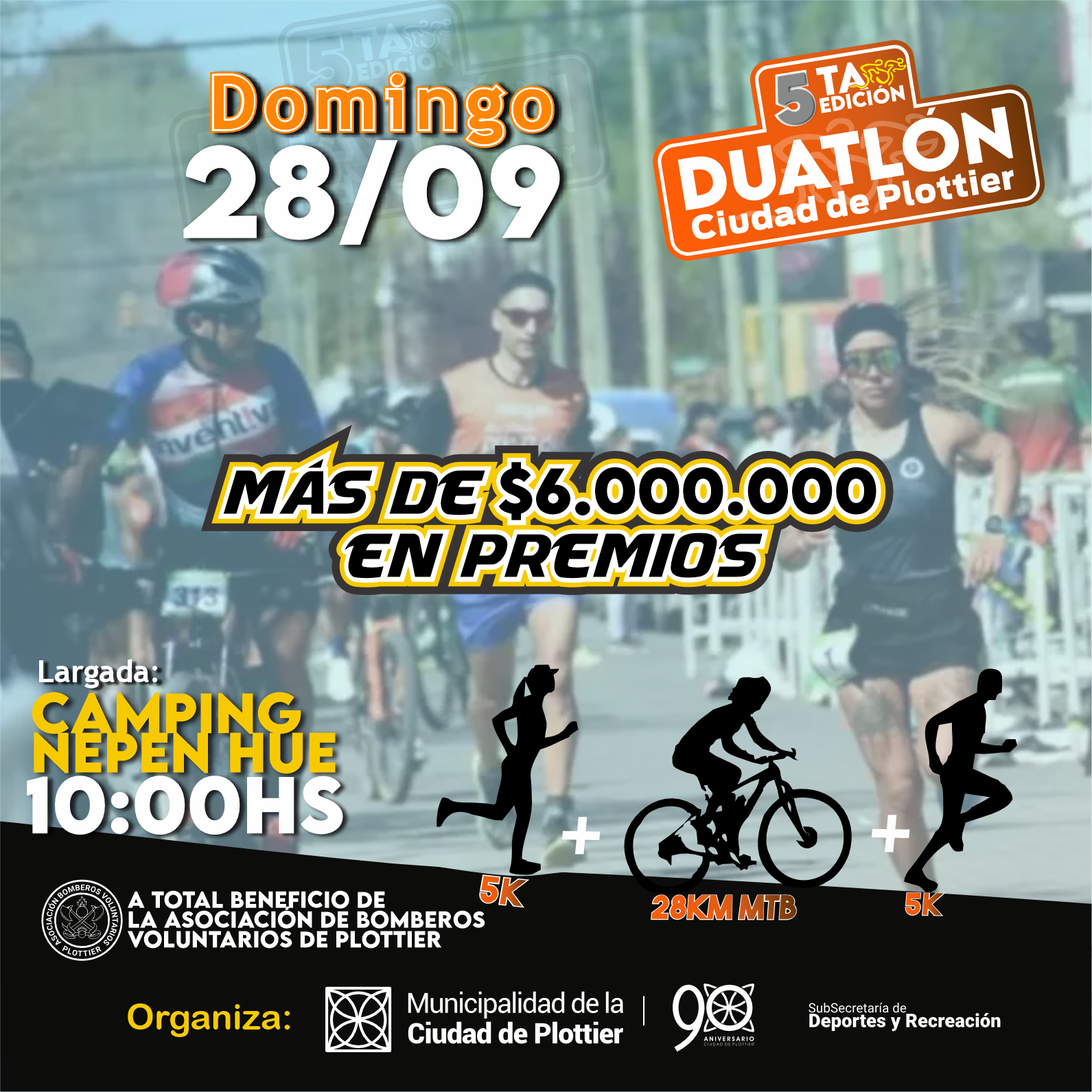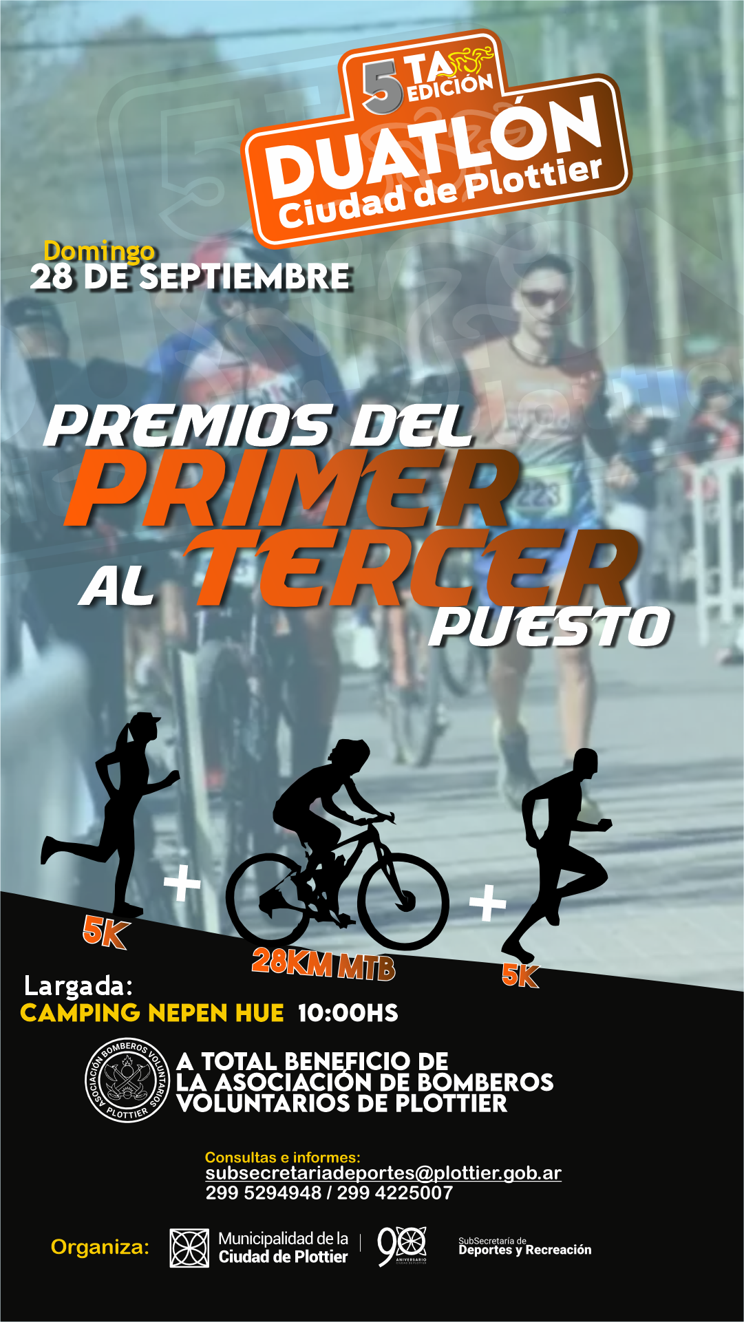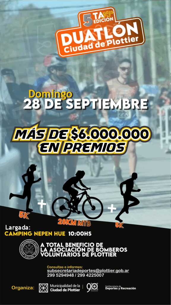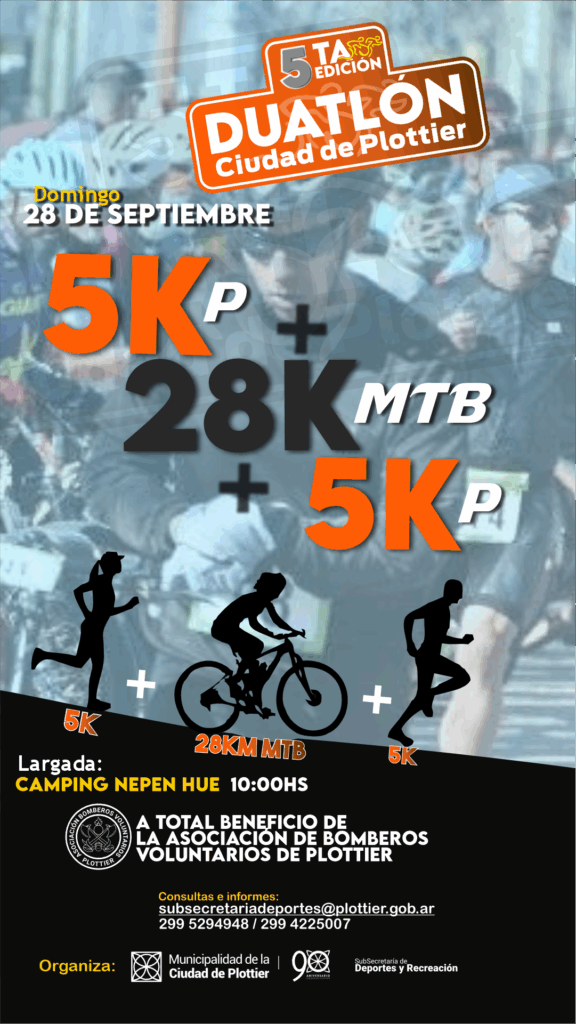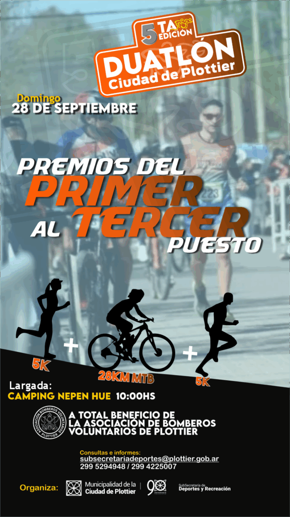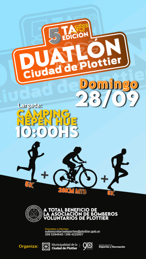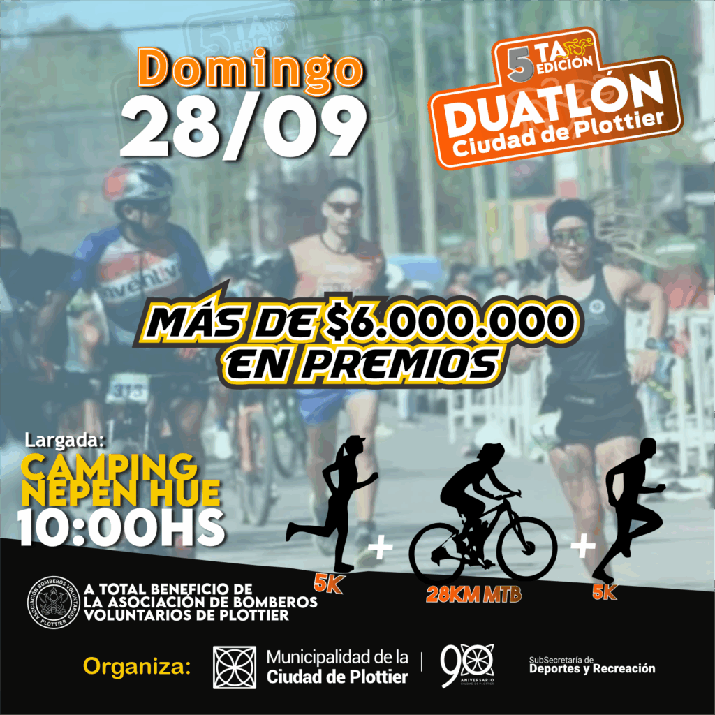 La Subsecretaría de Deporte y Recreación de la Municipalidad de Plottier organiza por 5° año consecutivo el duatlón, una prueba combinada deportiva, única en la localidad de Plottier. Esta edición se llevará adelante el domingo 28 de septiembre, con largada en el Camping Nepen Hue a las 10 hs. y el total de lo recaudado por las inscripciones será destinado al cuerpo de Bomberos de la ciudad.