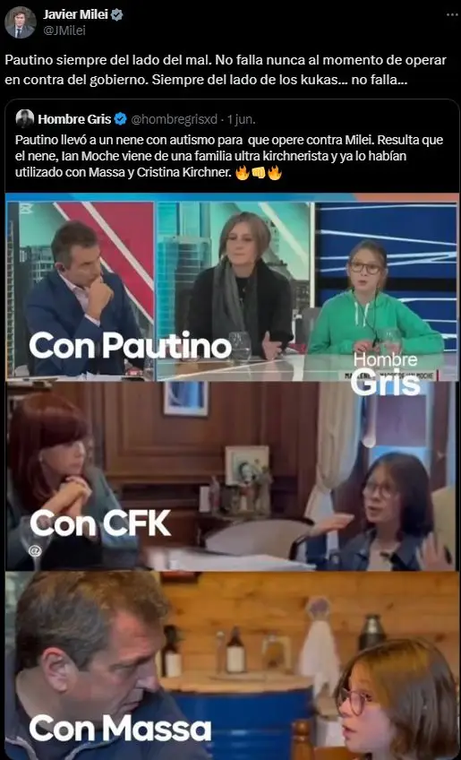 Luego, identificó a un troll oficialista, quien se presenta en las redes como «Hombre Gris«. «El 1 de junio de 2025, a las 10:28 horas, el usuario Hombre Gris realizó una publicación de fotos donde aparezco en el programa del periodista Paulino Rodríguez, en una reunión con Cristina Fernández de Kirchner y en una reunión son Sergio Massa acompañada del siguiente texto: ‘Pautino llevó a un nene con autismo para que opere contra Milei. Resulta que el nene, Ian Moche viene de una familia ultra kirchnerista y ya lo habían utilizado con Massa Cristina Kirchner’.
