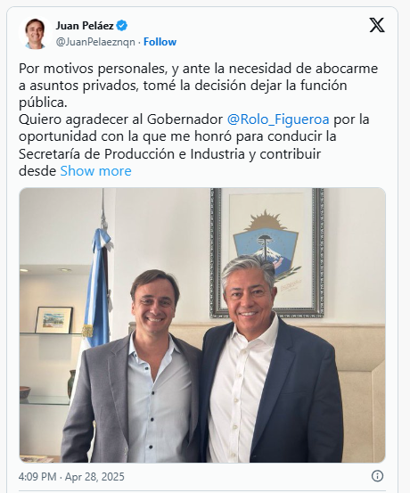 Juan Peláez anunció este lunes su renuncia como secretario de Producción e Industria de la provincia de Neuquén. A través de sus redes sociales, informó que la decisión responde a «motivos personales» y a la necesidad de «abocarse a asuntos privados».