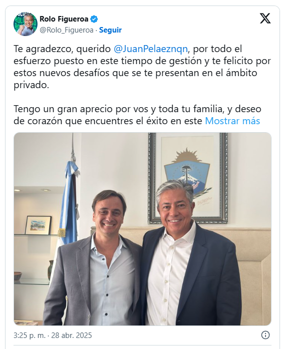 Por su parte, el gobernador Figueroa le dedicó un mensaje de agradecimiento: «Te felicito por estos nuevos desafíos que se te presentan en el ámbito privado», escribió, además de desearle éxito en esta nueva etapa.
