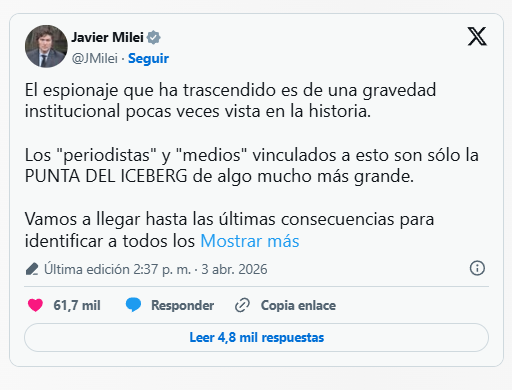 En su cuenta de X, el mandatario sostuvo que los periodistas y medios mencionados en la investigación serían «solo la punta del iceberg» de una estructura más amplia.