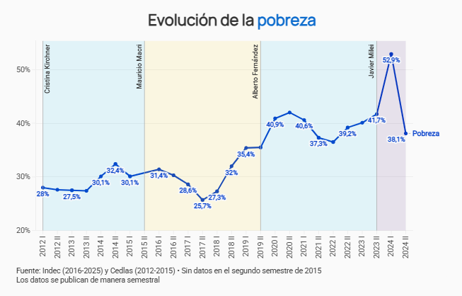 “La línea de pobreza volvió al nivel que tenía el primer semestre de 2022 y fue producto de un gran aumento que tuvo el salario informal en términos reales. Es decir, entre el primer semestre de 2024 y el segundo semestre de 2024, el salario informal creció un 80%, mientras que la línea de pobreza, o sea, el valor de la canasta básica total, creció apenas 26%”, estimó Jorge Colina, titular de Idesa. “El salario informal real subió un 43%. Y como el salario informal es la principal fuente de ingreso de los pobres, esto es lo que explica esa abrupta caída de la pobreza”, señaló.