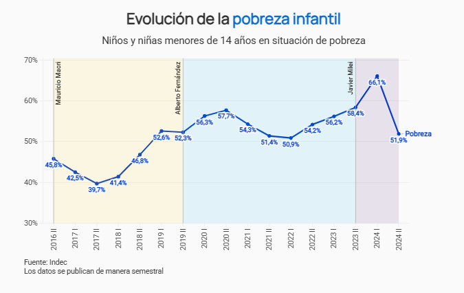 La información difundida por el INDEC muestra que el 51,9% de los niños de hasta 14 años son pobres. El porcentaje total de personas bajo la línea de pobreza para los grupos de 15 a 29 años y de 30 a 64 años es de 44,9% y 33,6%, respectivamente. En la población de 65 años y más, el 16%.