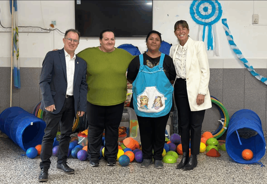 La ministra Julieta Corroza y el intendente Luis Bertolini entregaron elementos deportivos, recreativos y didácticos a los Centros de Cuidados Infantiles (CCI) de Plottier.
