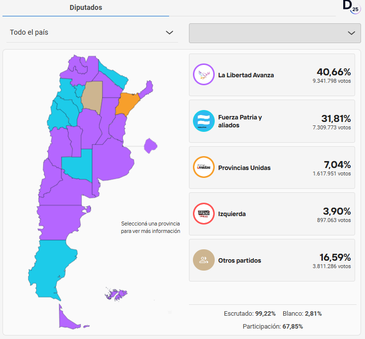 El presidente Javier Milei fue el gran triunfador de las elecciones. Consiguió la ratificación de su gestión: obtuvo la mayoría de los votos, pintó buena parte del país de violeta, logró un enorme crecimiento en el número de bancas y puso en crisis tanto al kirchnerismo como a Provincias Unidas.