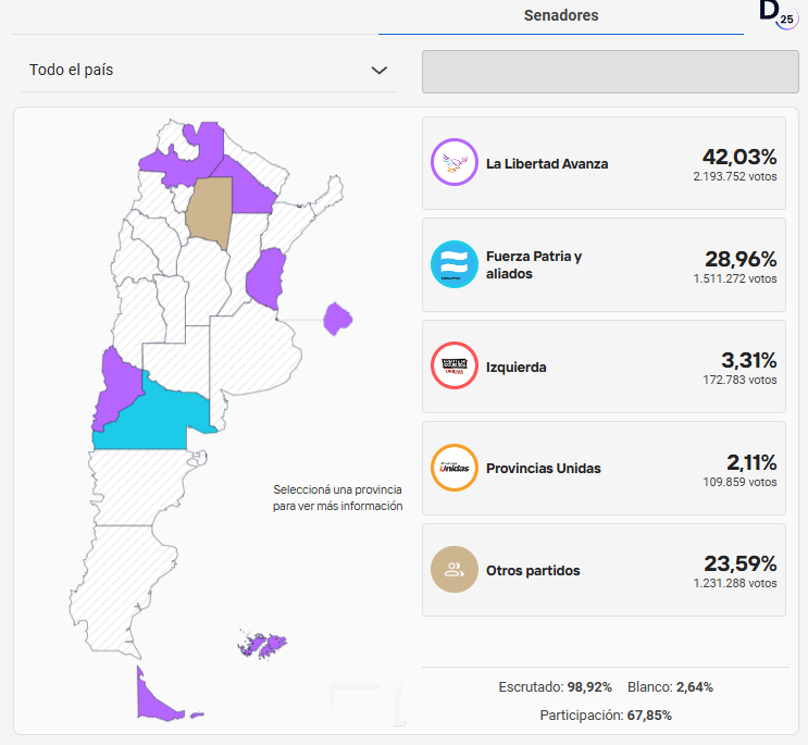 Los datos fueron categóricos: consiguió el 40,84% de los votos, es decir, 8,7 millones de sufragios, 14 puntos más que el Frente Patria. Pintó de violeta 16 provincias y sumó 64 nuevas bancas que, agregadas a las que ya tenía, lo dejan con 101 diputados entre propios y aliados. También logró cambiar la configuración del Senado: Fuerza Patria quedó mucho más lejos del quórum y la cámara quedó casi dividida en tercios imperfectos.
