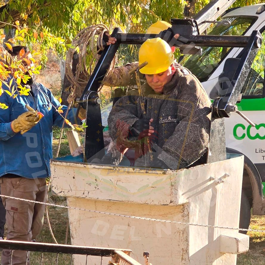 Horas más tarde, se sumó al operativo una hidrogrúa aportada por la Cooperativa de Luz de Plottier, lo que permitió avanzar con las maniobras de rescate. También se hicieron presentes autoridades policiales y personal especializado en fauna.