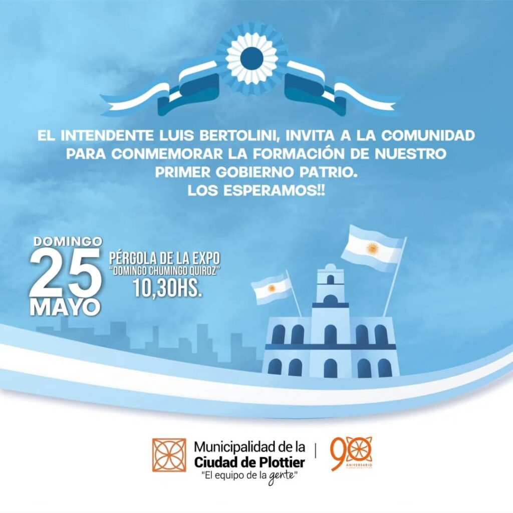 La Municipalidad de Plottier invita a toda la comunidad a participar del acto oficial por el 25 de Mayo, que se llevará a cabo este sábado a las 10:30 h en el predio Domingo «Chumingo» Quiroz.