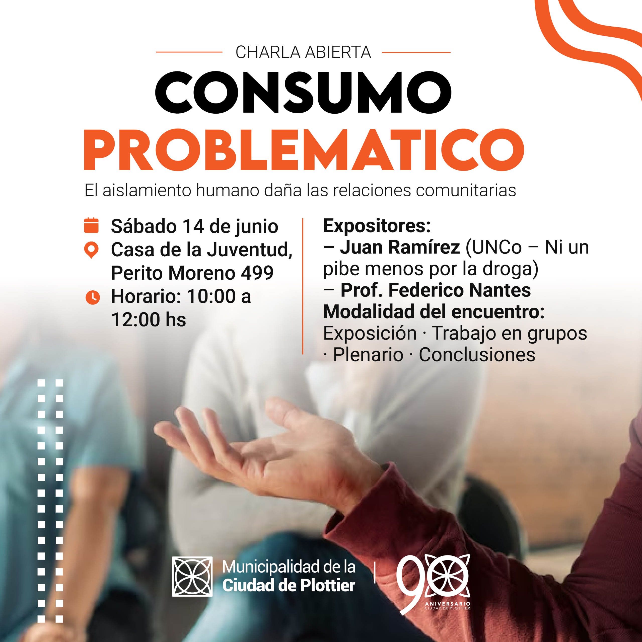 La actividad incluirá una exposición a cargo de Juan Ramírez, coordinador general del Servicio de Prevención y Atención de Adicciones de la Universidad Nacional del Comahue, con la presentación del programa “Ni un pibe menos por la droga”. También disertará Federico Nantes, educador y trabajador social, y se compartirá el testimonio de una persona que atravesó y logró salir del consumo problemático.