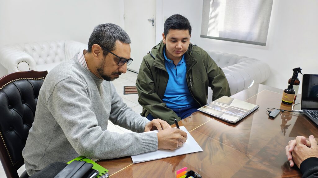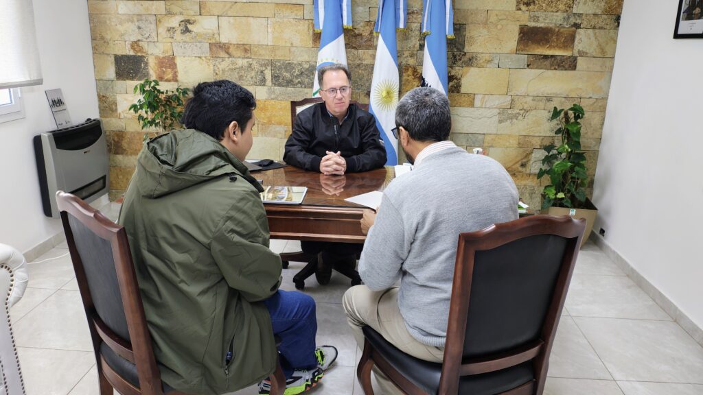 El intendente de Plottier, Luis Bertolini, recibió a Pablo Quiroga, estudiante de la Universidad Nacional del Comahue y vecino de la ciudad, quien, junto a su docente Marcelo Aráoz, está trabajando en un importante proyecto para el lanzamiento de un satélite.