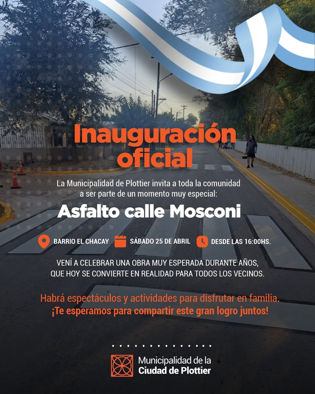 La ciudad de Plottier vivirá este sábado una jornada especial con la inauguración oficial del asfalto de la calle Mosconi, una obra largamente esperada por los vecinos del Barrio El Chacay y que ya es una realidad.