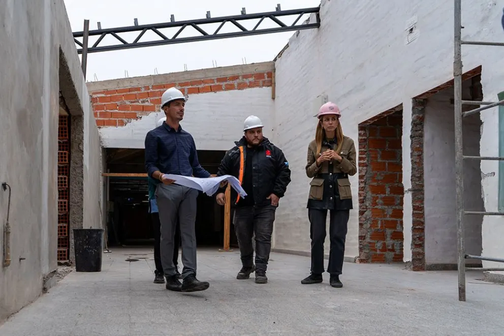 En el sector de la escuela, las tareas incluyen la ejecución de nuevas aulas, cocina y área administrativa (secretaría/sala de gobierno), además de la refuncionalización de espacios existentes. Actualmente, se avanza con trabajos de revoque y la estructura de la cubierta de techo.