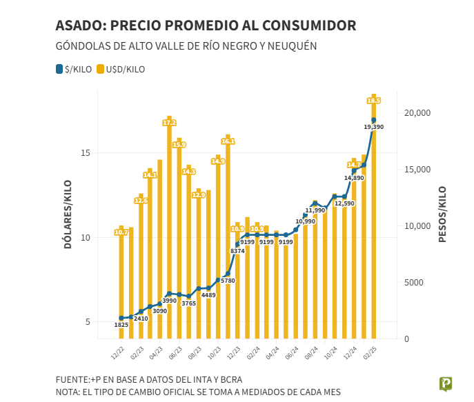 Actualmente, el precio del asado en la Patagonia ha alcanzado valores récord, tanto en moneda local como en dólares. Esta situación refuerza la posibilidad de importar este corte desde Brasil, donde su consumo es marginal y se comercializa a precios considerablemente más bajos. En el mercado brasileño, el kilo de asado se ubica en torno a 5 o 6 dólares (5.300 a 6.400 pesos argentinos), mientras que, de llegar a la región patagónica, su precio podría ser inferior a 10.000 pesos por kilo.