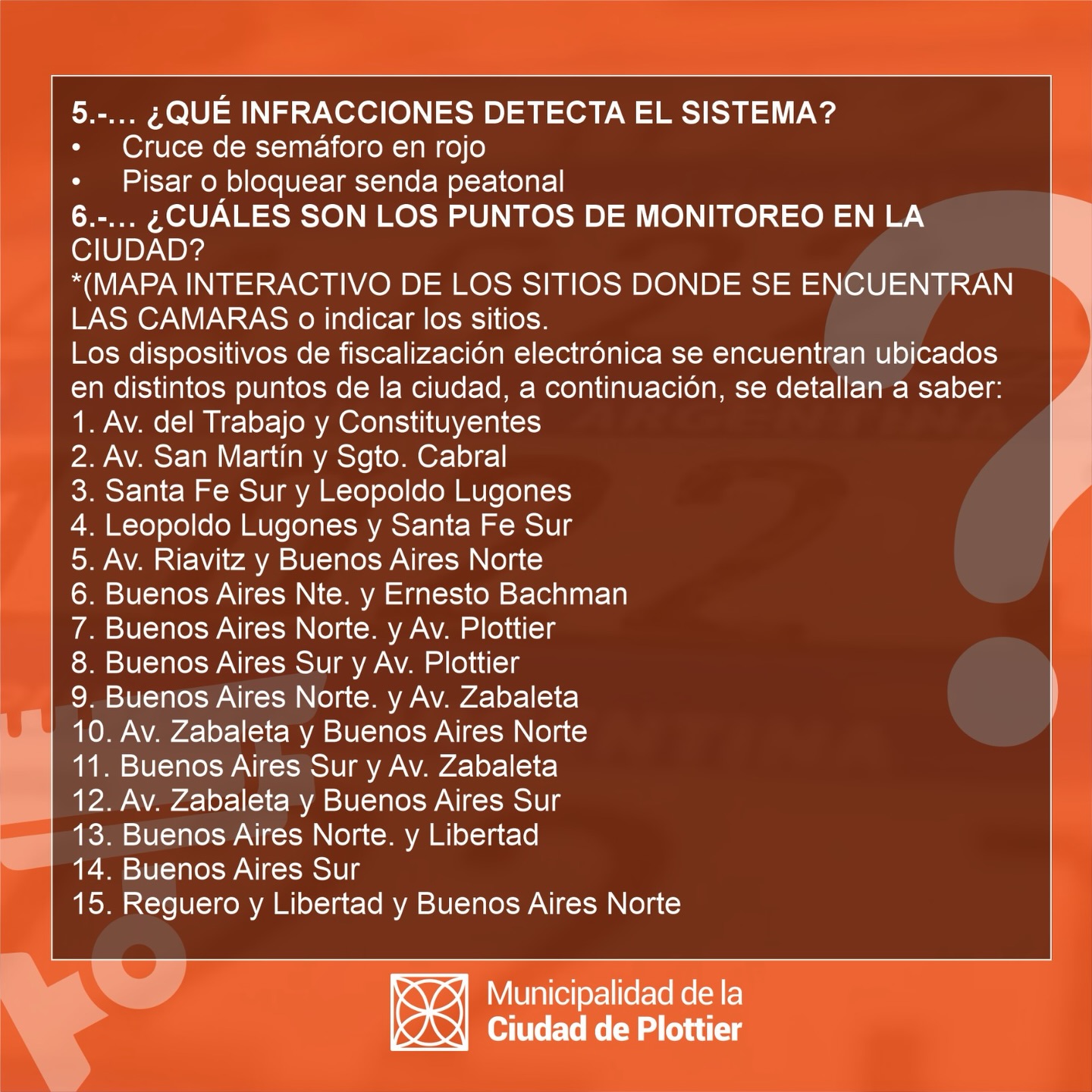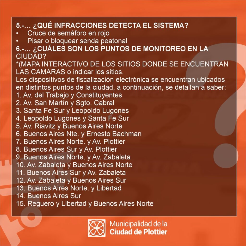 El sistema permite registrar presuntas infracciones mediante dispositivos electrónicos instalados en distintos puntos de Plottier. La medida busca prevenir conductas de riesgo y reducir los siniestros viales, contribuyendo a una circulación más segura para vecinos y vecinas.