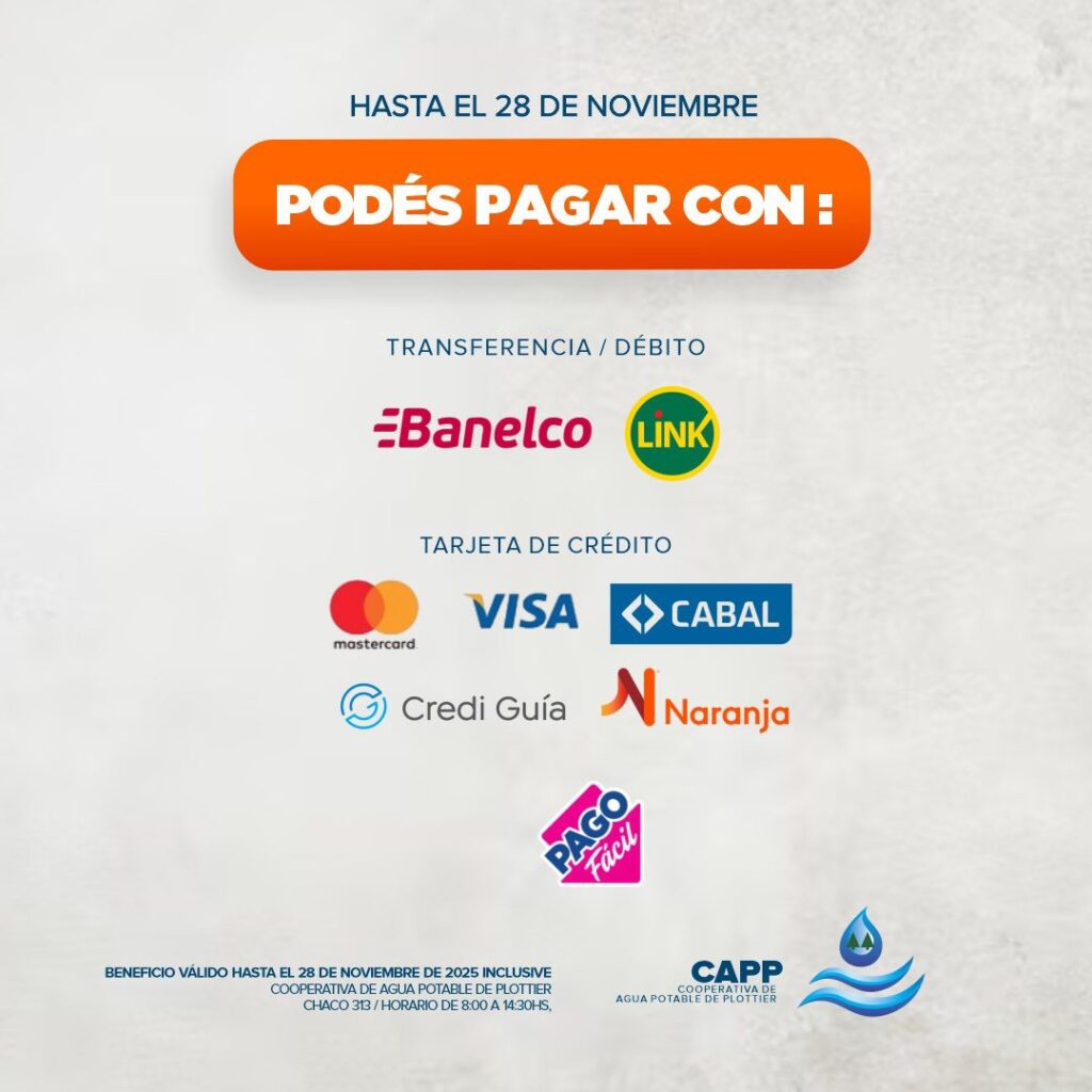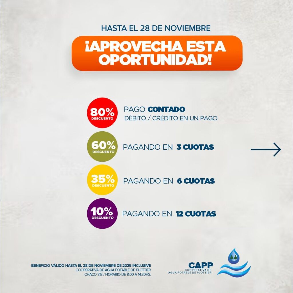 Plottier *Ponete al día* con la Cooperativa de Agua Potable Plottier Redacción SDN Published: 20 octubre, 2025 | Updated: 20 octubre, 2025 1 min de lectura Compartir en redes sociales Hasta el 28 de noviembre y aprovecha la moratoria con importantes descuentos en los intereses! Te esperamos en nuestras oficinas Calle Chaco313 de 8:00 a 14:30 h About the Author Redacción SDN Administrator Visit Website View All Posts What do you feel about this? 0% Love 0% Funny 0% Wow 0% Sad 0% Angry Plottier Post navigation Previous: Crisis hídrica y agraria en Neuquén: los puntos clave del decreto provincialNext: Escrutinio provisorio: Fuerza Patria pidió a la Justicia Electoral que la DINE difunda los resultados por distrito Deja una respuesta Cancelar la respuestaTu dirección de correo electrónico no será publicada. Los campos obligatorios están marcados con *Comentario * Nombre * Correo electrónico * Web Author's Other Posts Plottier: controlan incendio forestal en la zona de Laguna Helena Plottier: controlan incendio forestal en la zona de Laguna Helena 21 octubre, 2025 Milei refuerza su apoyo a los candidatos de Neuquén y destaca el rol energético de la provincia Milei refuerza su apoyo a los candidatos de Neuquén y destaca el rol energético de la provincia 21 octubre, 2025 Rodrigo Paz ganó un histórico balotaje y se convirtió en el presidente electo de Bolivia Rodrigo Paz ganó un histórico balotaje y se convirtió en el presidente electo de Bolivia 20 octubre, 2025 Donald Trump: “Argentina está luchando por su vida, se están muriendo” Donald Trump: “Argentina está luchando por su vida, se están muriendo” 20 octubre, 2025 Historias relacionadas Plottier Plottier: controlan incendio forestal en la zona de Laguna Helena Redacción SDN 21 octubre, 2025 Plottier Plottier potencia su identidad turística Redacción SDN 18 octubre, 2025 Plottier La Coope Plottier *COMUNICADO IMPORTANTE* Redacción SDN 17 octubre, 2025 Plottier Dos días de duelo por Azul Semeñenko Redacción SDN 17 octubre, 2025 Plottier Gacetilla Municipalidad de Plottier Redacción SDN 16 octubre, 2025 Plottier Acción policial en Plottier frustra intento de robo múltiple Redacción SDN 16 octubre, 2025