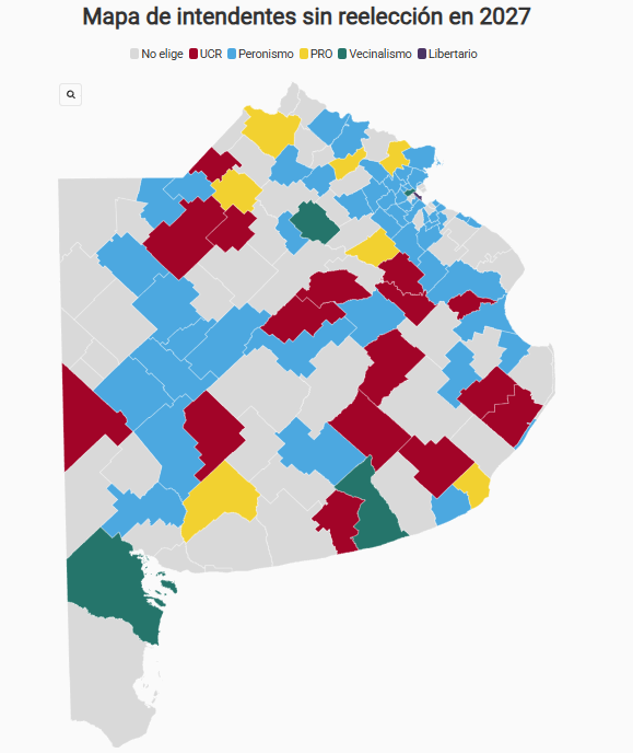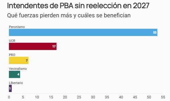La ley que limita las reelecciones indefinidas volvió a convertirse en una pieza central del tablero político bonaerense. Si la normativa vigente no se modifica antes de 2027, 82 de los 135 intendentes de la provincia de Buenos Aires estarán impedidos de competir por un nuevo mandato. El impacto es transversal, pero no simétrico: 53 son peronistas, 17 radicales, siete del PRO, cuatro vecinalistas y uno de La Libertad Avanza.
