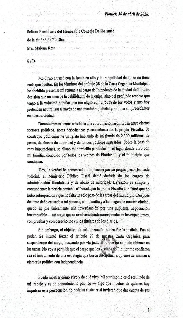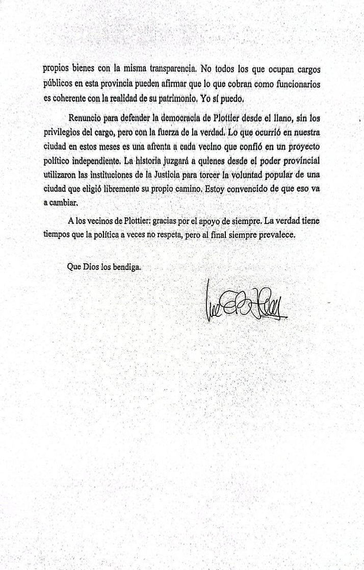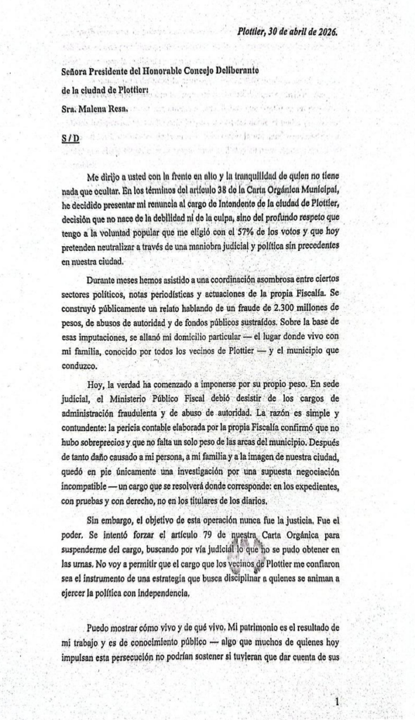 La dimisión del jefe comunal fue presentada después que la Justicia no pidió su prisión domiciliaria, posteriormente de su suspensión por parte de la mayoría de los concejales y en medio de una investigación judicial por presuntas irregularidades en el manejo de fondos públicos.