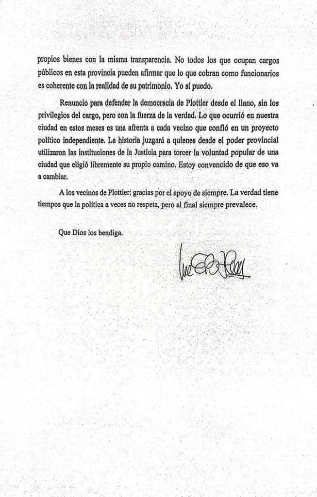 En su carta, Bertolini denunció una “maniobra judicial y política” en su contra y aseguró que su salida busca “defender la democracia” desde otro lugar y dejo en claro que su renuncia no responde a una admisión de culpa, sino a la necesidad de “defender la democracia” desde otro lugar, en medio de lo que considera un proceso irregular.