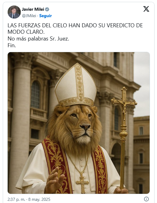 Mientras, el propio Milei posteó en su cuenta de X una imagen generada con inteligencia artificial del prelado con cabeza de león. «Las fuerzas del cielo han dado su veredicto de modo claro. No más palabras, señor juez», reza su mensaje.