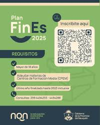 El Plan FinEs 2025 (Plan de Finalización de estudios primarios y secundarios) es un programa nacional que permite a las personas mayores de 18 años rendir las materias que adeuden del secundario, con extensión también para interesados en Neuquén.